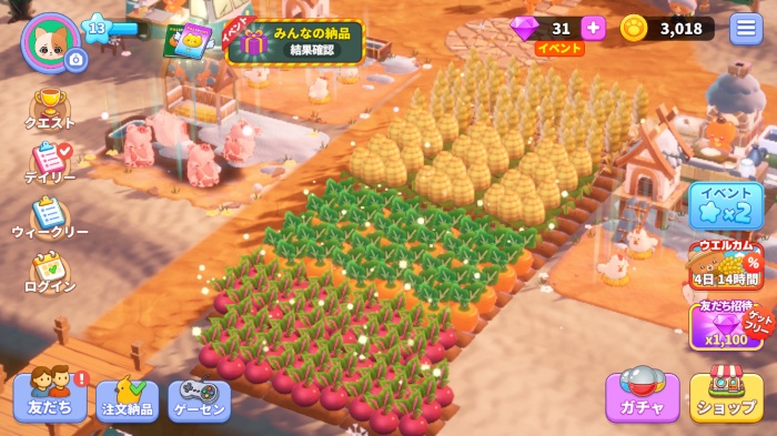 作物を育てたり、収穫したりしながら農園を発展させていく、シンプルで遊びやすい農園系ゲームです。